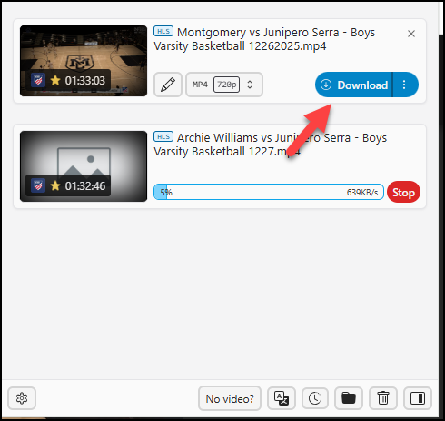 If your school team is not in the video, or if your school is not using NFHS cameras, you'll need a third party program to download it to your laptop or PC. We've found that the Chrome extension Video DownloadHelper works well.