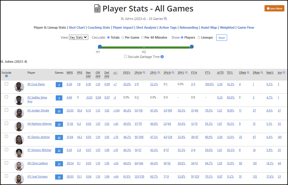Lineup stats are also easy to access, as well as player impact reports (on/off) for individuals, groups of two, or groups of three.